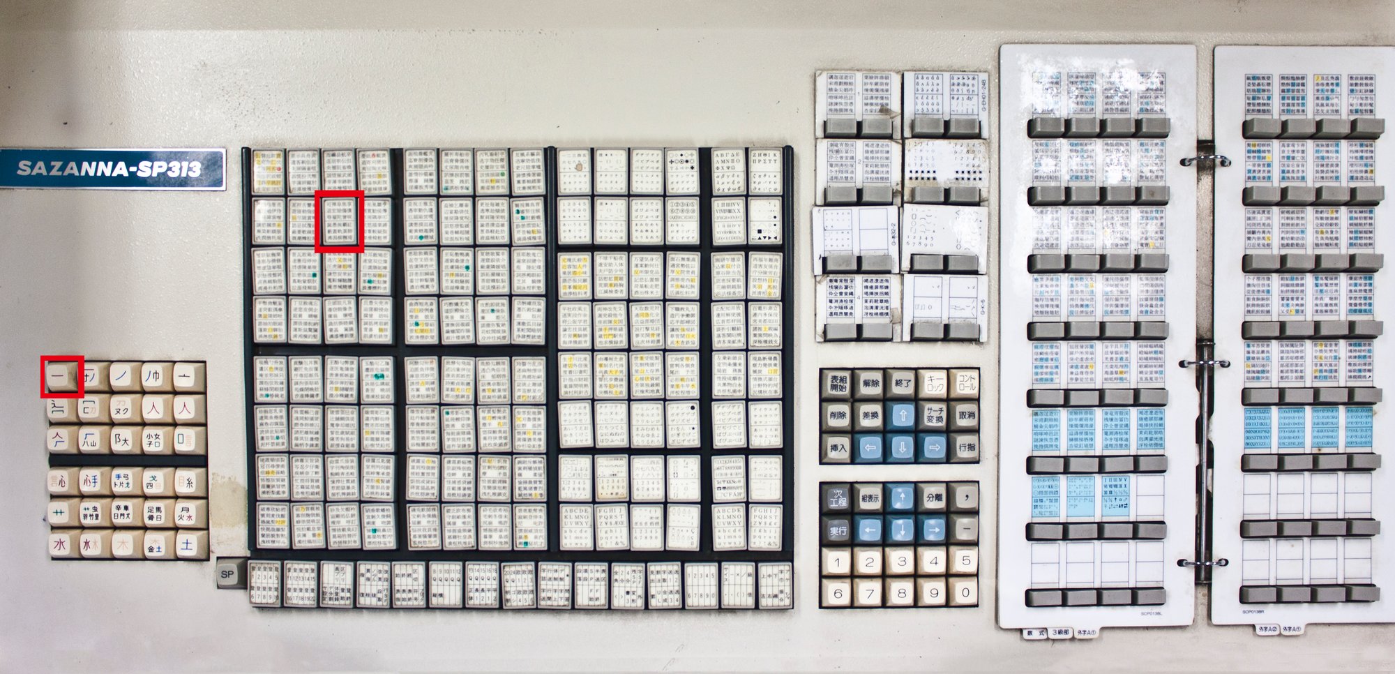 In this series whose theme seems to rapidly approach every road leads to Japan, I also have to mention a Japanese typesetting Sazanna keyboard with a whopping 30 shifts, and a page-turning interface next to them.
