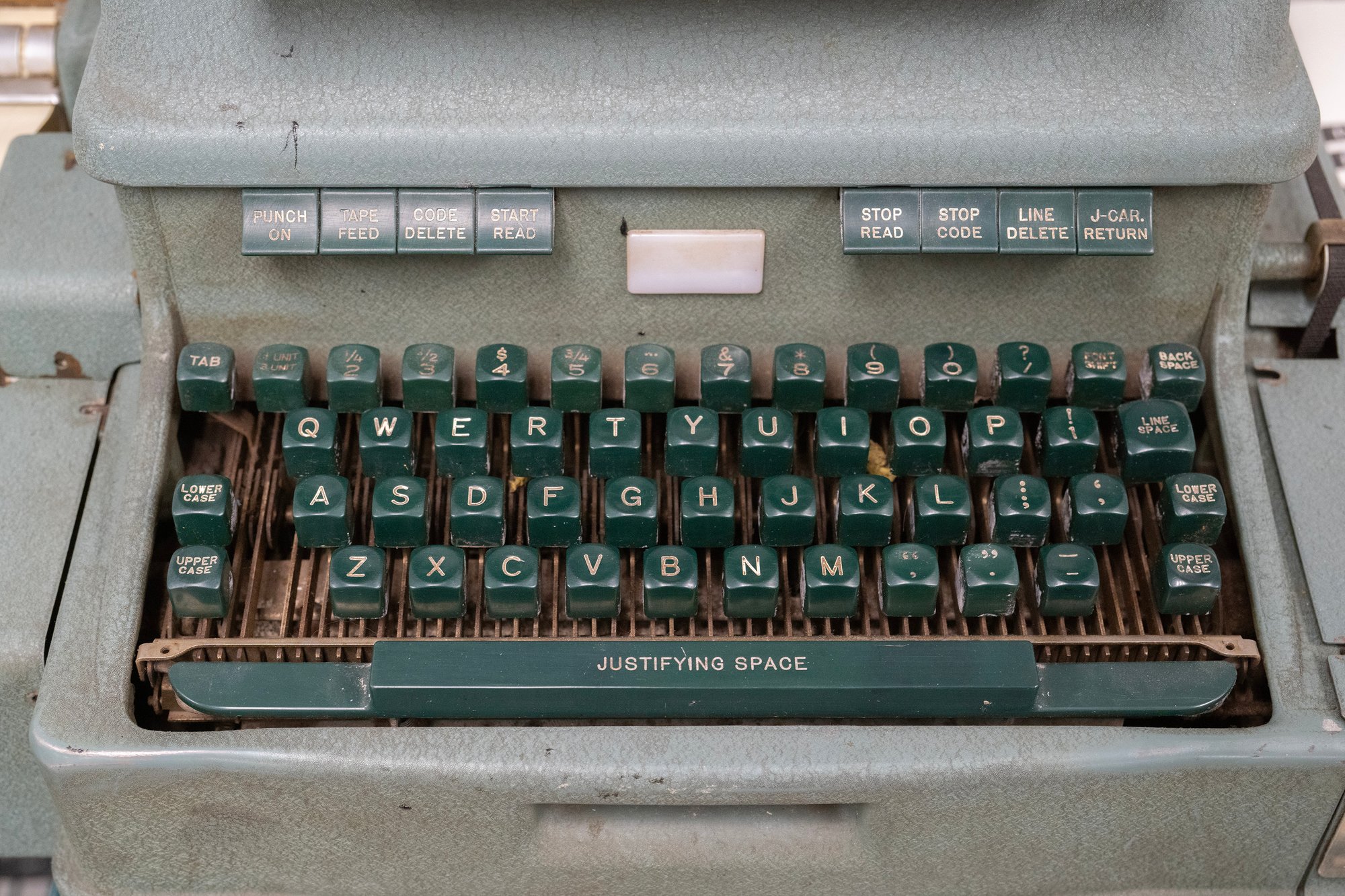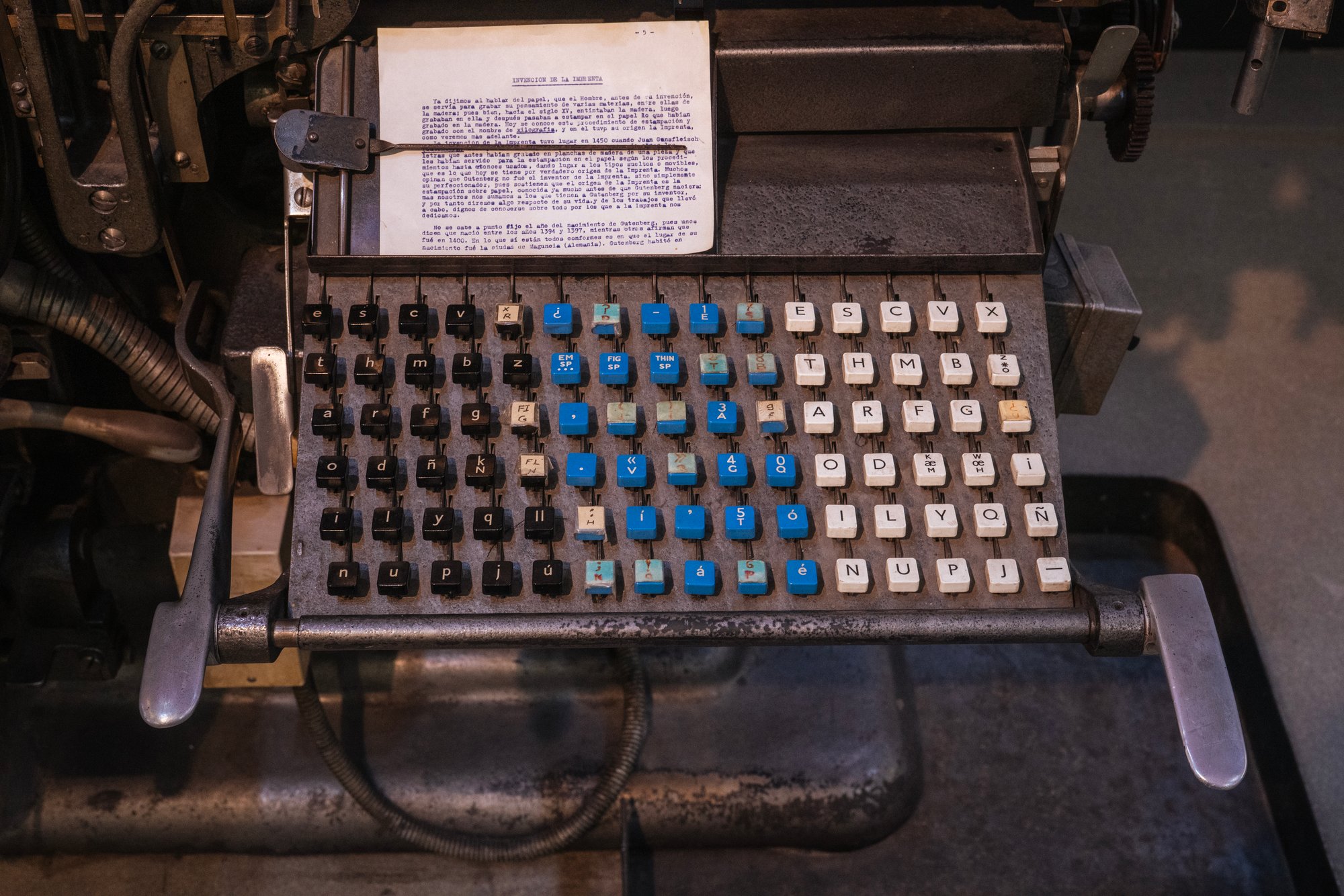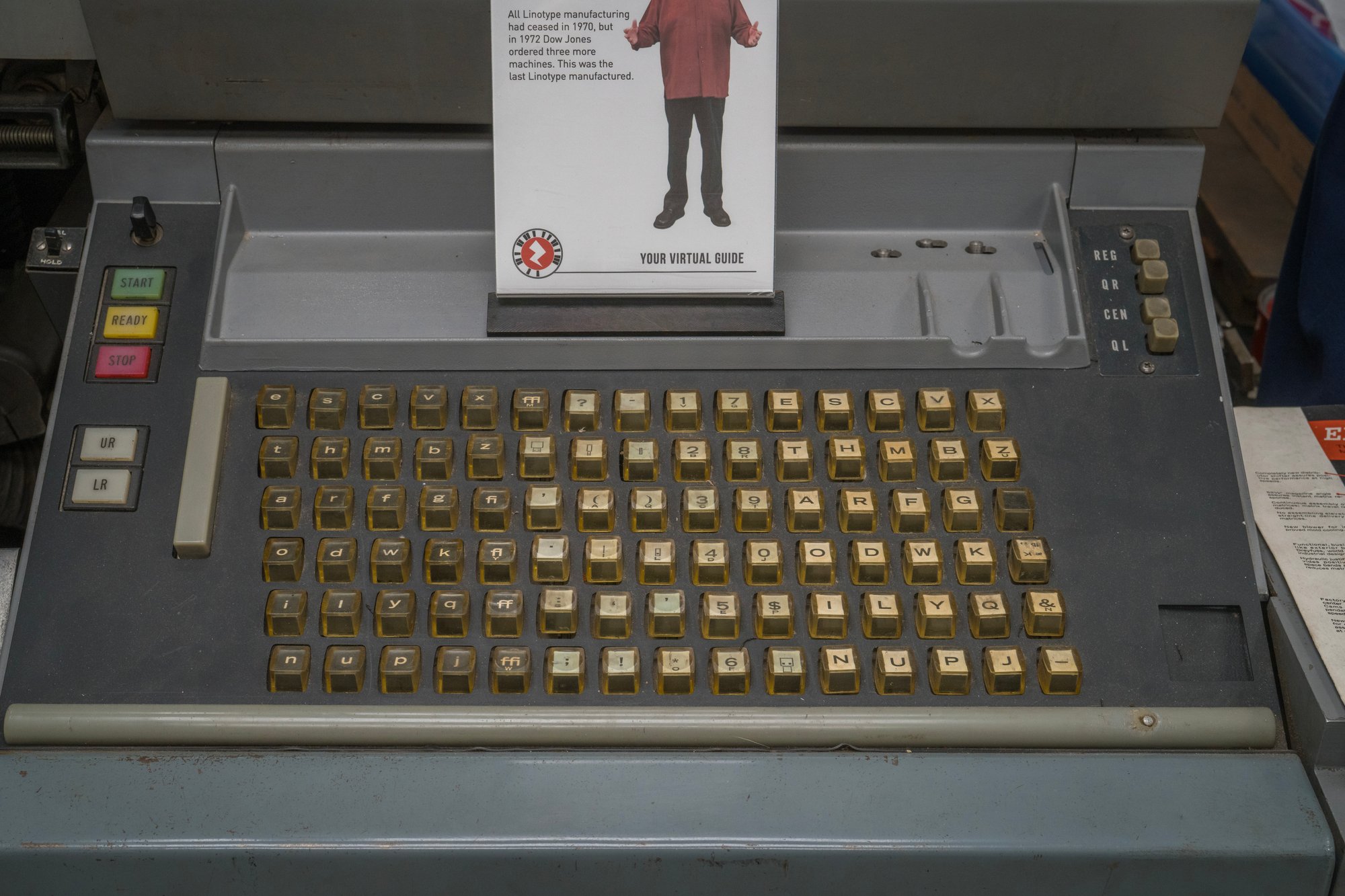 The legends are generally all fascinating; if typography is already filled with strange words – please don’t ask me about “orphans” and “widows” and “bastard type” – then typesetting layers even more alien stuff atop, with various extremely specialized keyboards (counting keyboards, perforating keyboards, blind keyboards) talking about center quadding and H&J (hyphenation and justification), sporting pairs of keys for each quotation mark, and seemingly infinite keys for the infinite flavors of spaces.