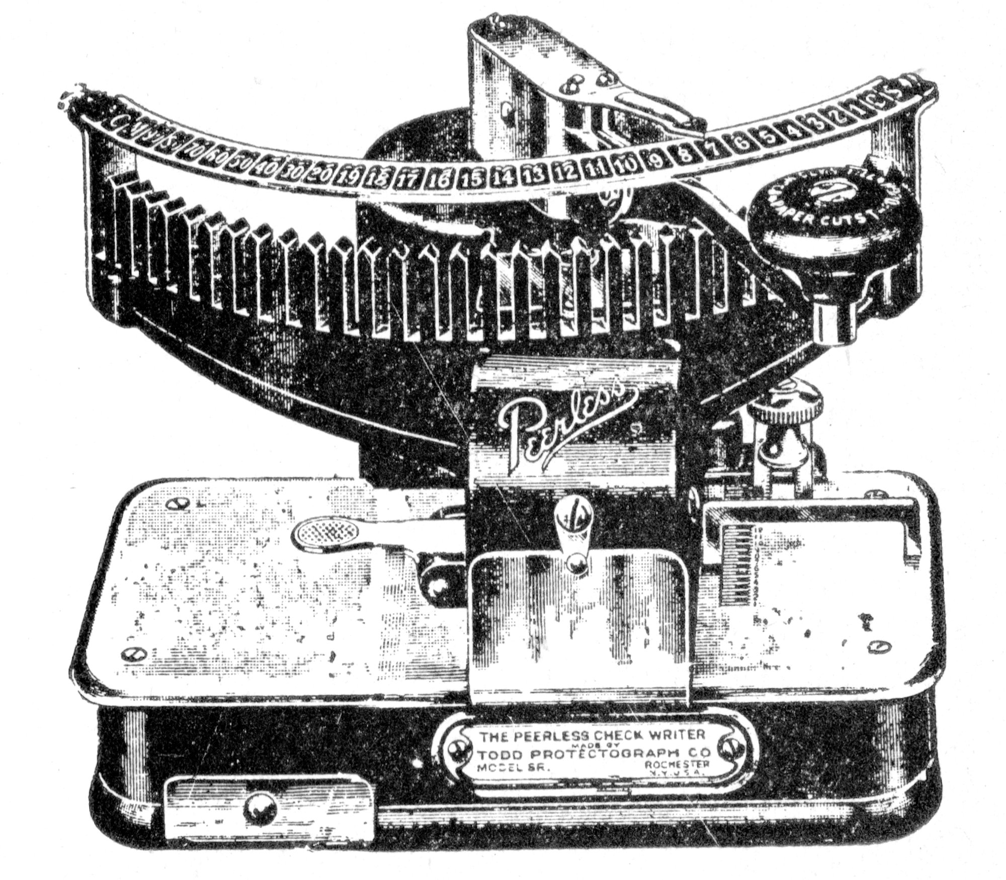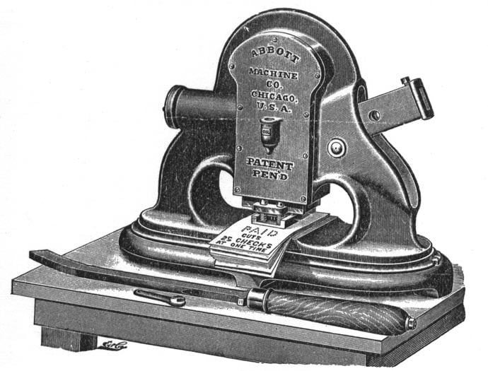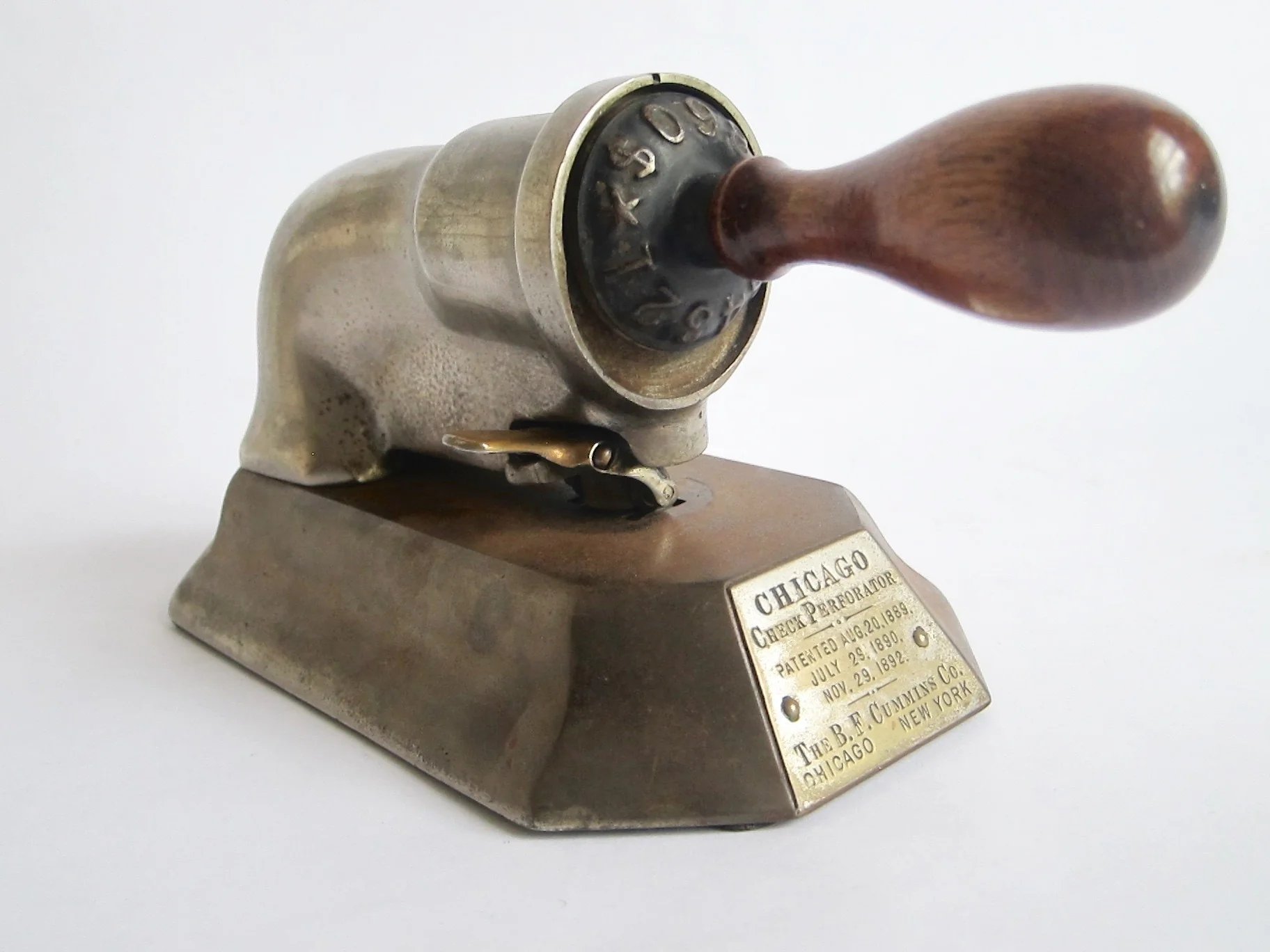So starting in the late 19th century, various check protector products started floating around – some printing, some embossing, some macerating, some shredding, and some perforating. It was a whole mini-universe existing to embellish checks with something more secure than ink.
