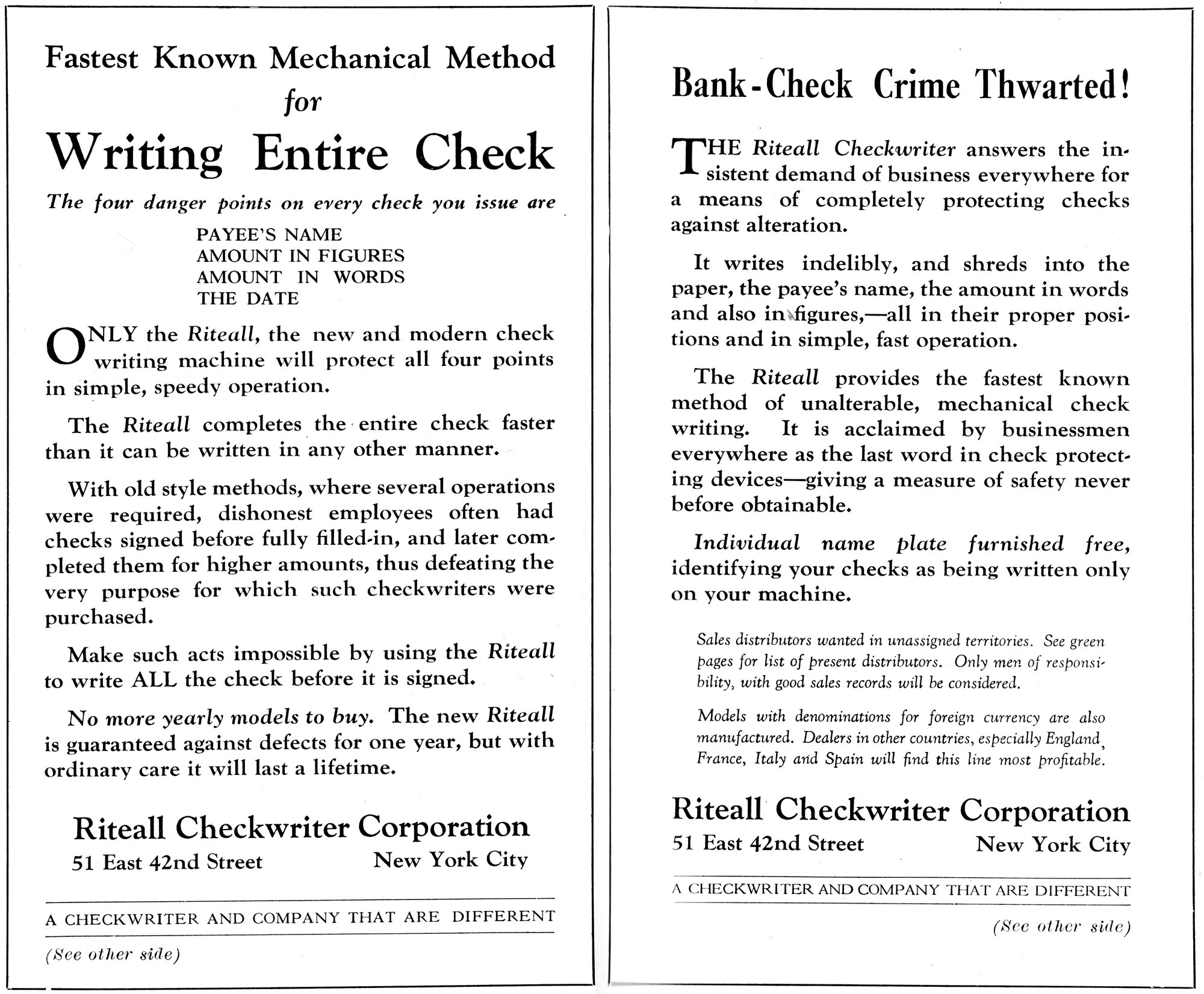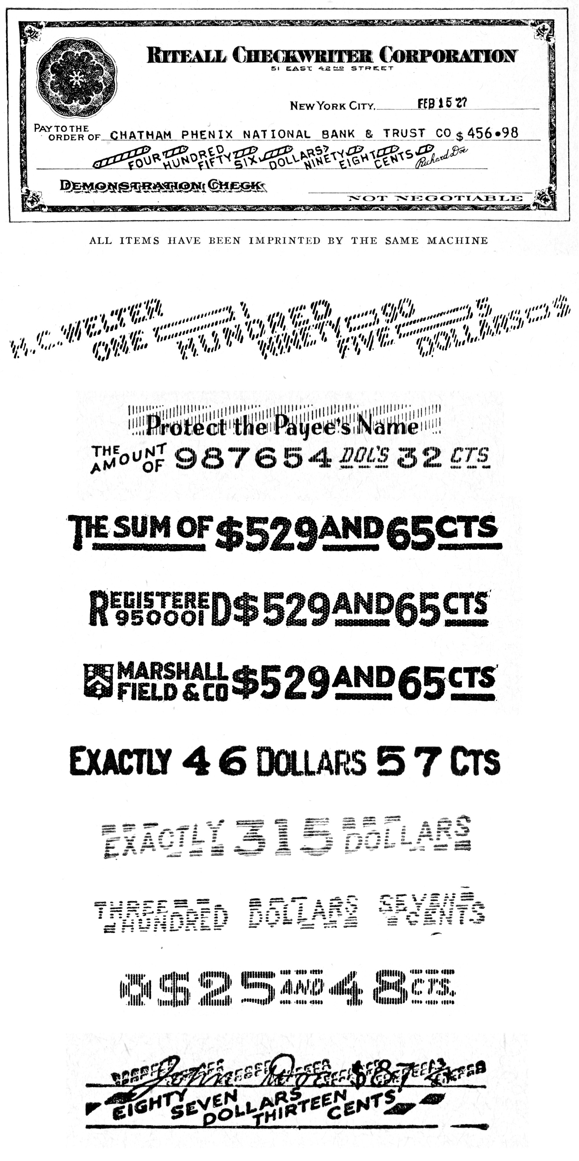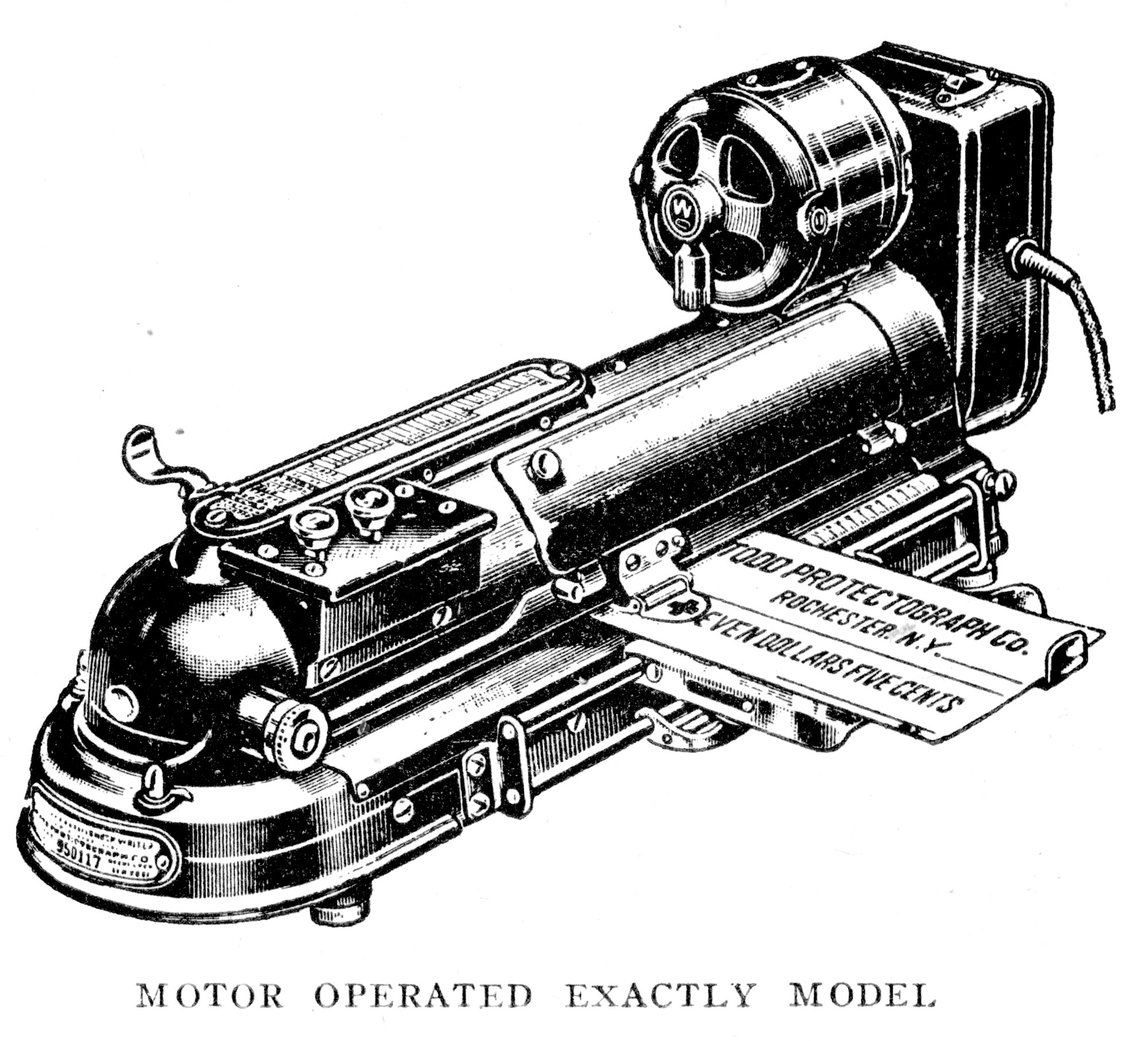 So starting in the late 19th century, various check protector products started floating around – some printing, some embossing, some macerating, some shredding, and some perforating. It was a whole mini-universe existing to embellish checks with something more secure than ink.