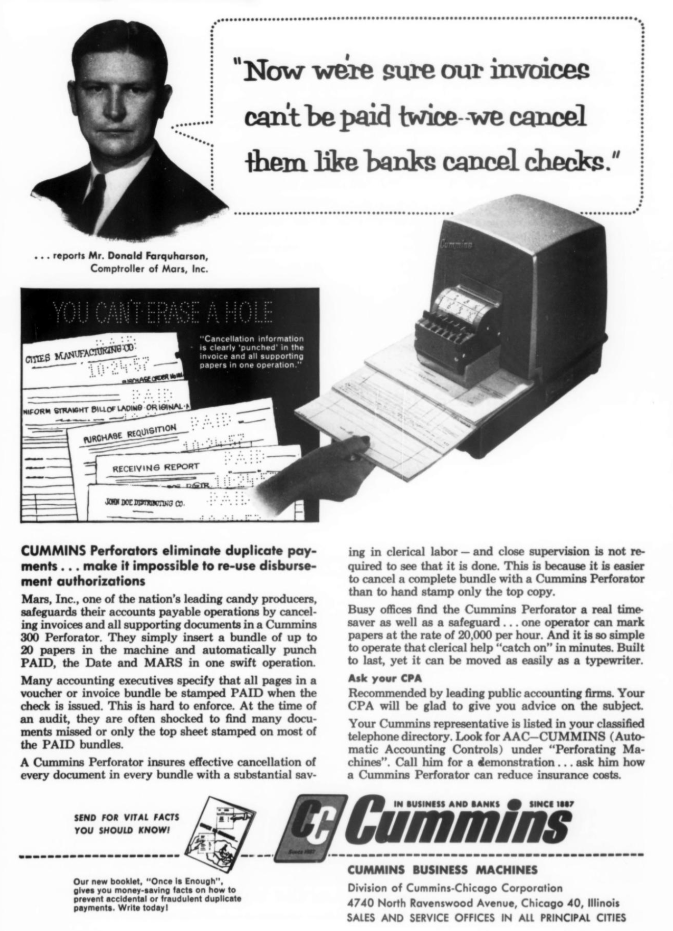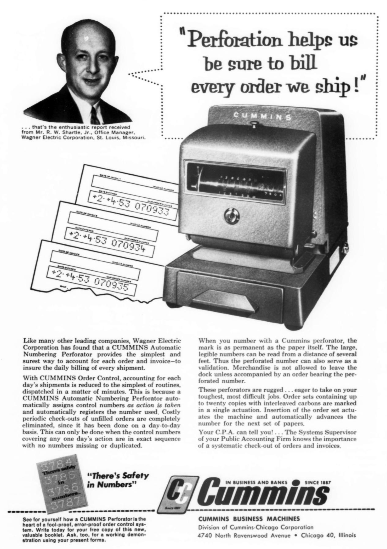 Cummins made similar check perforators – with digits only, and appropriately smaller – but also a host of other machines, including perforators for the post office, and much more modern machines.