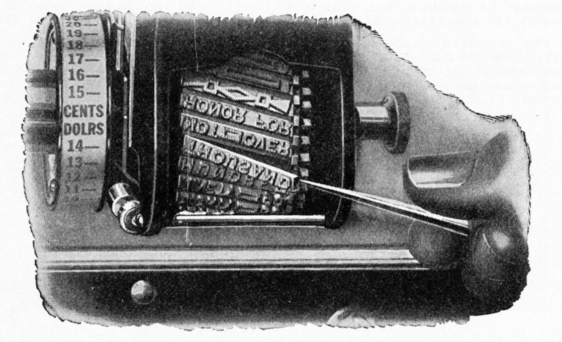 How to use it? First, you slide a piece of paper into a slot at the bottom. Then, you use a “keyboard,” one that feels very similar to those index typewriters from chapter 3: you rotate to a desired letter left or right, with a satisfying series of metallic dinks. You can see it on the video below: